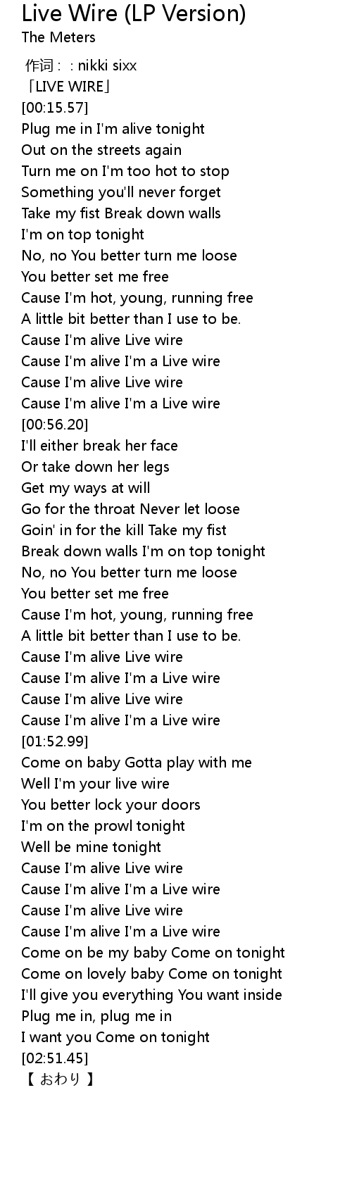 | [00:43.02] | Cause I' m alive I' m a Live wire |