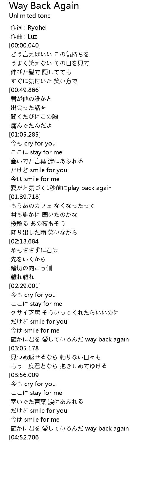 | [02:51.730] | 確かに君を 愛しているんだ way back again |