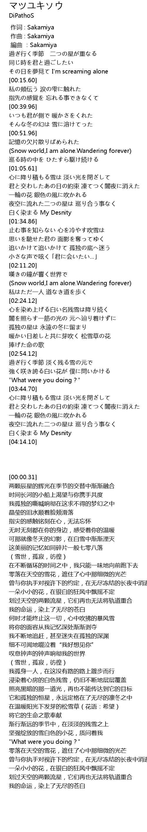 | [02:14.96] | Snow world, I am alone. Wandering forever |