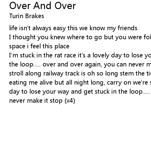 | I'm stuck in the rat race it's a lovely day to lose your way and get stuck in the loop..... over and over again, you can never make it stop (x4) my old bones stroll along railway track is oh so long stem the tide, the nine to five slowly eating me alive but all night long, carry on we're stumbling slowly to a lovely day to lose your way and get stuck in the loop..... over and over again, you can never make it stop (x4) |