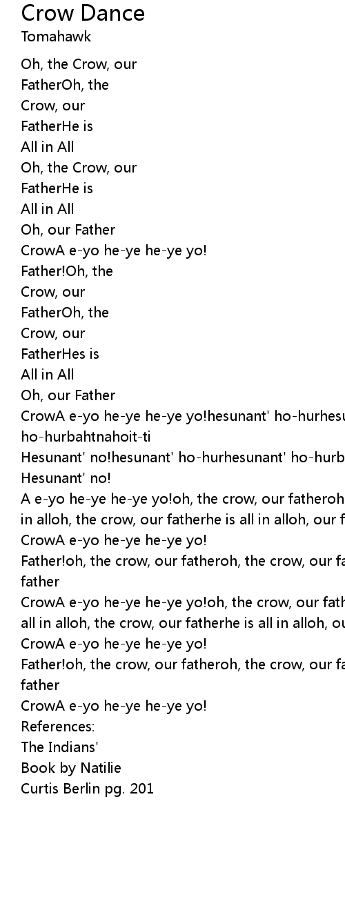 | CrowA e-yo he-ye he-ye yo!oh, the crow, our fatheroh, the crow, our fatherhe is all in alloh, the crow, our fatherhe is all in alloh, our father | |