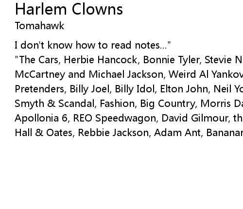 | "The Cars, Herbie Hancock, Bonnie Tyler, Stevie Nicks, Men At Work, ZZ Top, Paul McCartney and Michael Jackson, Weird Al Yankovic, Cyndi Lauper, Pink Floyd, the Pretenders, Billy Joel, Billy Idol, Elton John, Neil Young, Sheena Easton, Patty Smyth & Scandal, Fashion, Big Country, Morris Day & The Time, John Lennon, Apollonia 6, REO Speedwagon, David Gilmour, the Rolling Stones, Pat Benatar, Hall & Oates, Rebbie Jackson, Adam Ant, Bananarama.... |