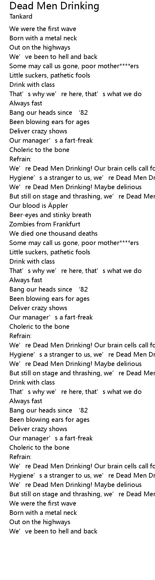 | But still on stage and thrashing, we' re Dead Men Drinking! | |