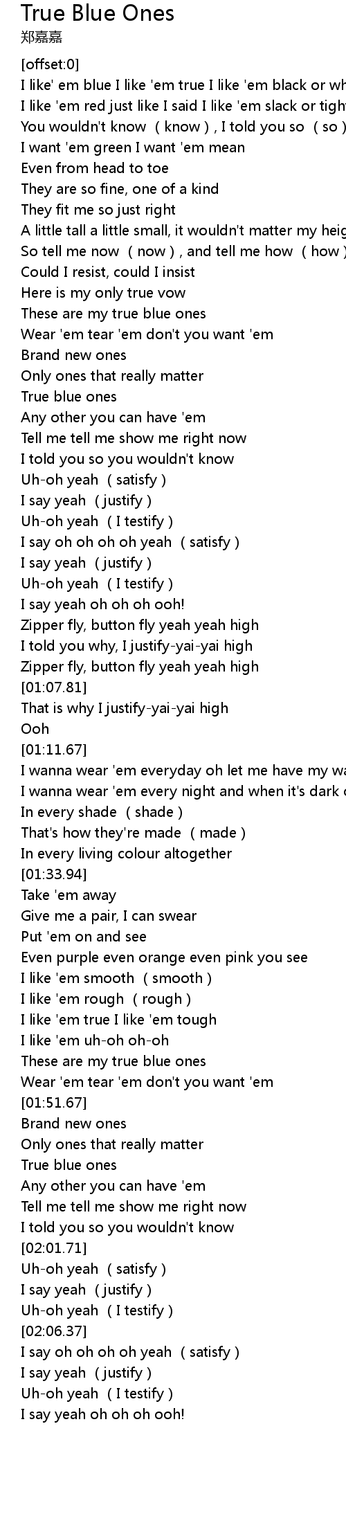 | [00:07.05] | I like' em blue I like 'em true I like 'em black or white |