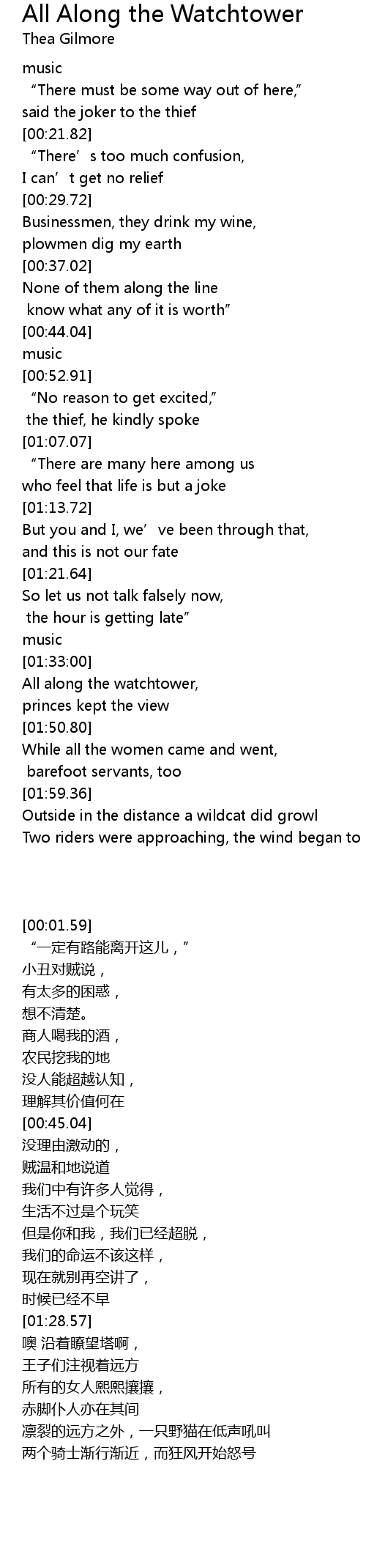 | [01:45.48] | All along the watchtower, |