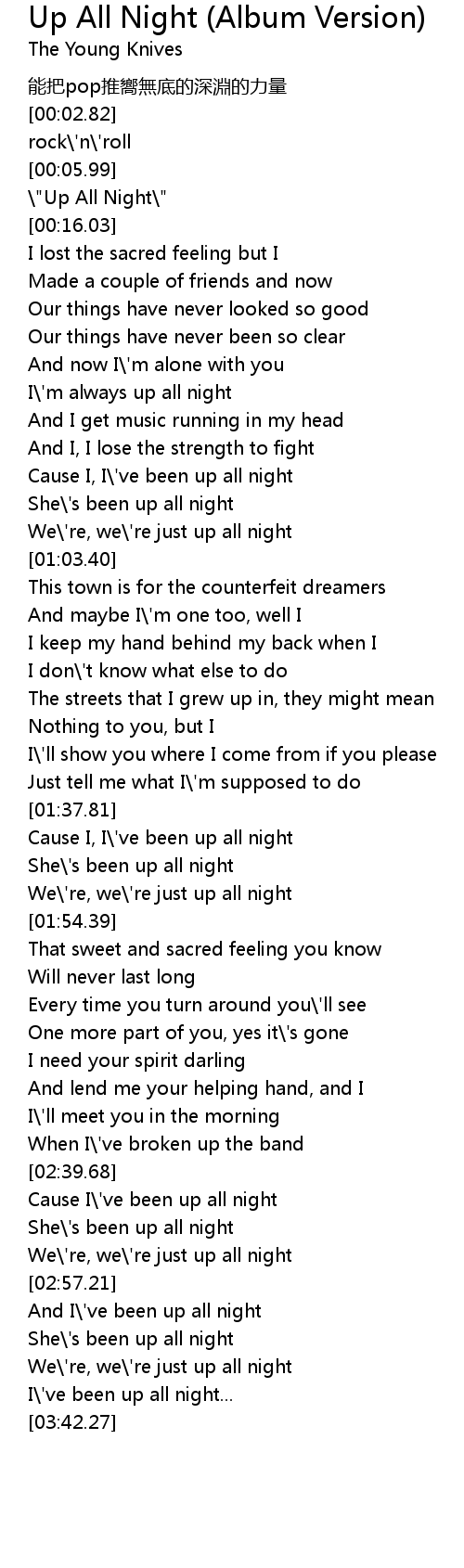 | [00:13.77] | \"Up All Night\" |