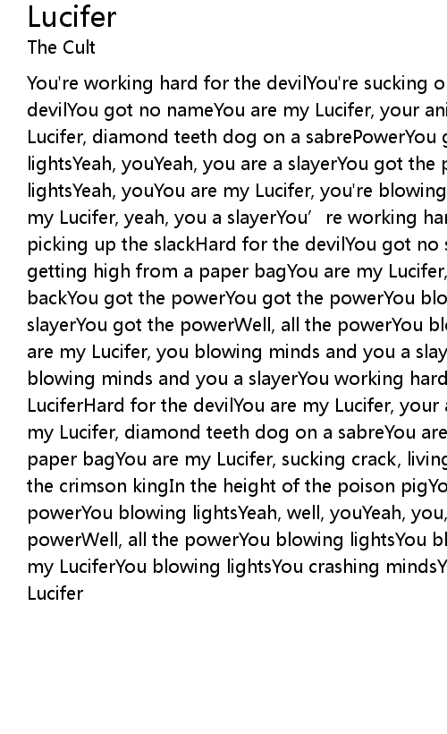 | You're working hard for the devilYou're sucking on the crackYou're hard for the devilYou got no nameYou are my Lucifer, your animal bones cry natureYou are my Lucifer, diamond teeth dog on a sabrePowerYou got the powerYou blowing lightsYeah, youYeah, you are a slayerYou got the powerAll the powerYou blowing lightsYeah, youYou are my Lucifer, you're blowing minds and you a slayerYou are my Lucifer, yeah, you a slayerYou’re working hard for the devilYou’re picking up the slackHard for the devilYou got no shameYou are my Lucifer, getting high from a paper bagYou are my Lucifer, sucking crack, living on your backYou got the powerYou got the powerYou blowing lightsYeah, youYeah you, you a slayerYou got the powerWell, all the powerYou blowing mindsYou blowing lightsYou are my Lucifer, you blowing minds and you a slayerYou are my Lucifer, you blowing minds and you a slayerYou working hard for the devilYou are my LuciferHard for the devilYou are my Lucifer, your animal bones cry natureYou are my Lucifer, diamond teeth dog on a sabreYou are my Lucifer, getting high from a paper bagYou are my Lucifer, sucking crack, living on your backIn the hall of the crimson kingIn the height of the poison pigYou got the powerWell, all the powerYou blowing lightsYeah, well, youYeah, you, you are a slayerYou got the powerWell, all the powerYou blowing lightsYou blowing mindsYou a slayerYou are my LuciferYou blowing lightsYou crashing mindsYou blowing mindsYou are my Lucifer |