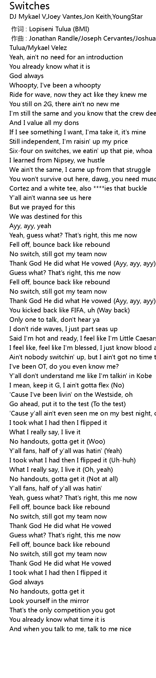 | [01:43.50] | Y'all fans, half of y'all was hatin' (Yeah) |