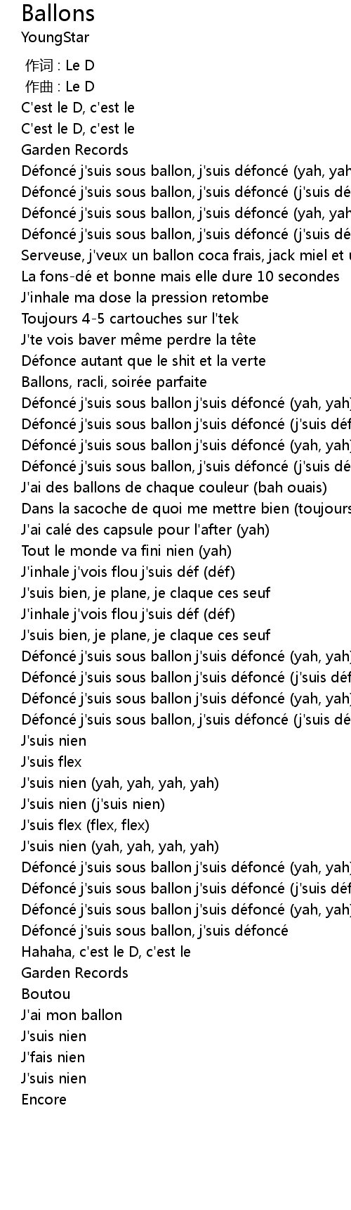 | [00:38.95] | De fonce j' suis sous ballon j' suis de fonce yah, yah |