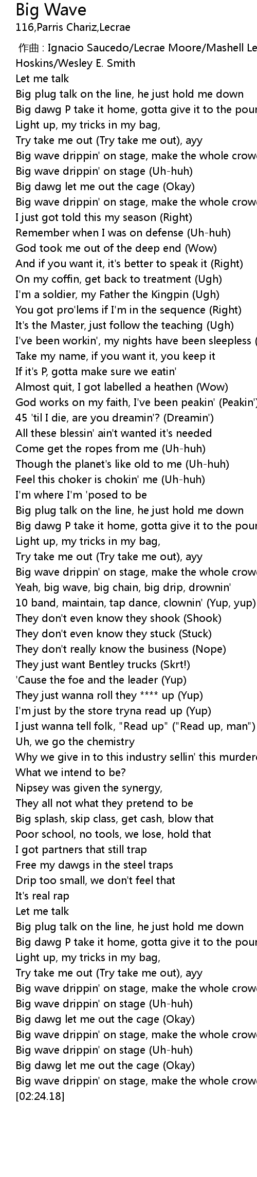 | [02:20.29] | Big wave drippin' on stage, make the whole crowd drown (P) |