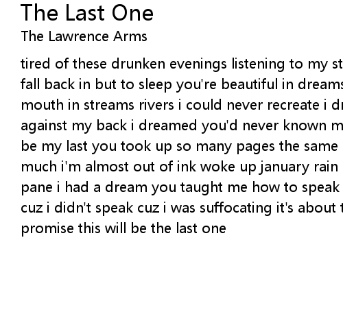 tired of these drunken evenings listening to my staggered breathing nowhere to fall back in but to sleep you're beautiful in dreams where words pour from my mouth in streams rivers i could never recreate i dreamed you traced worlds against my back i dreamed you'd never known me last night i said that this would be my last you took up so many pages the same dead words in different phrases so much i'm almost out of ink woke up january rain idly sliding down the window pane i had a dream you taught me how to speak i wrench my hands around my neck cuz i didn't speak cuz i was suffocating it's about time i started to believe i promise this will be the last one