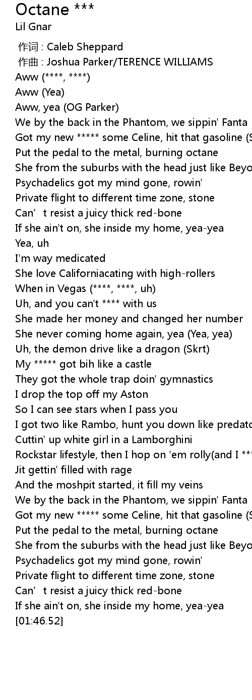 | [01:21.19] | Got my new ***** some Celine, hit that gasoline (Skrt) |