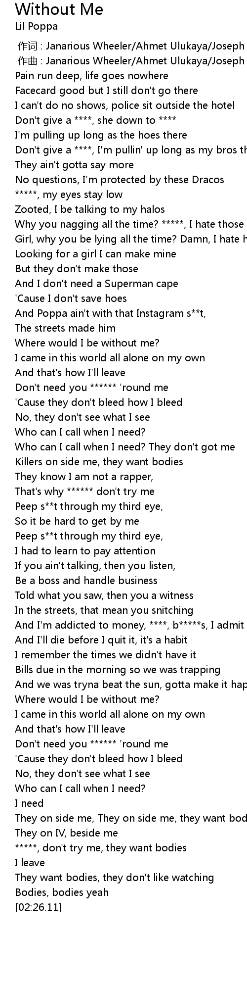 | [01:11.37] | Who can I call when I need? They don' t got me |