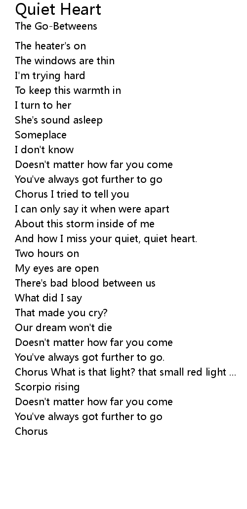 And how I miss your quiet, quiet heart. |