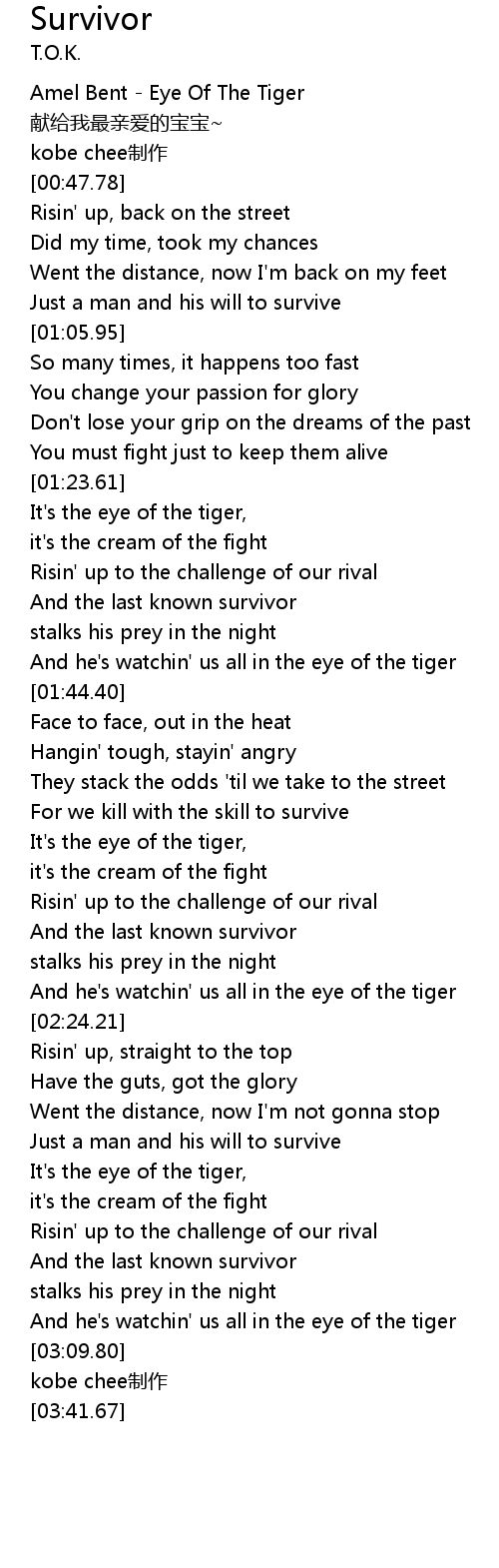 | [03:01.63] | And he' s watchin' us all in the eye of the tiger |