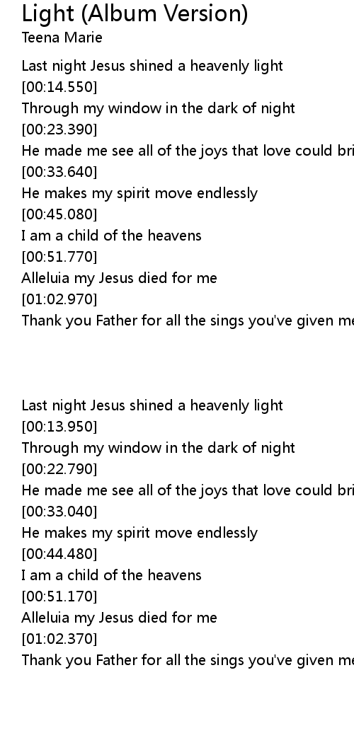 | [00:07.980] | Last night Jesus shined a heavenly light |