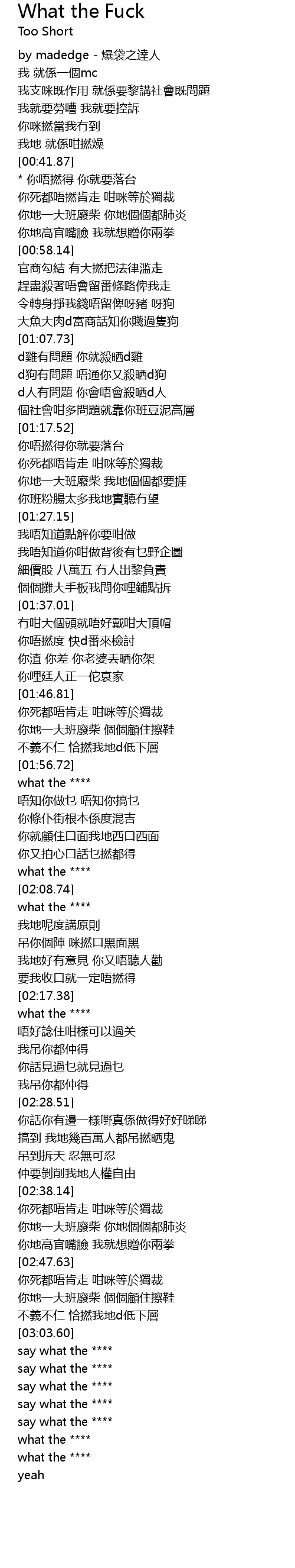 | [02:30.65] | 搞到 我地幾百萬人都吊撚晒鬼 |