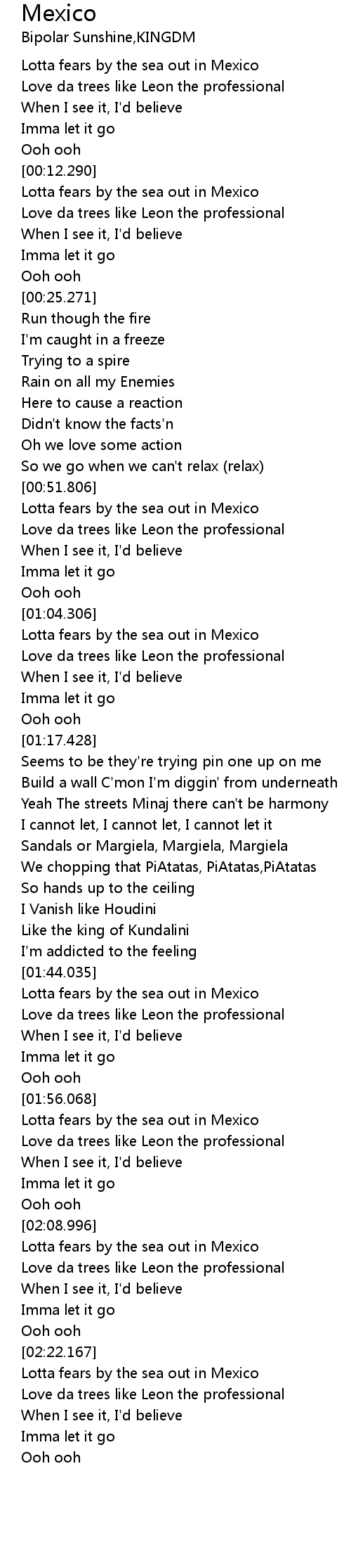 | [00:12.449] | Lotta fears by the sea out in Mexico |