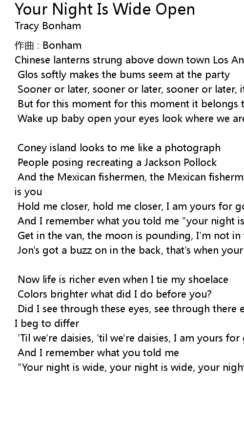 | " Your night is wide, your night is wide, your night is wide open" |