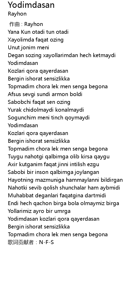 | [02:45.47] | Yodimdasan kozlari qora qayerdasan |