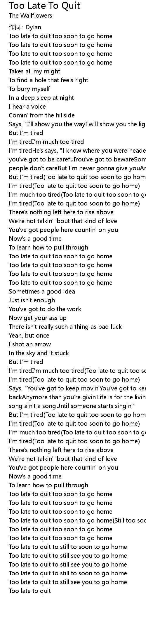 | Too late to quit too soon to go home(Still too soon to go home) | |
