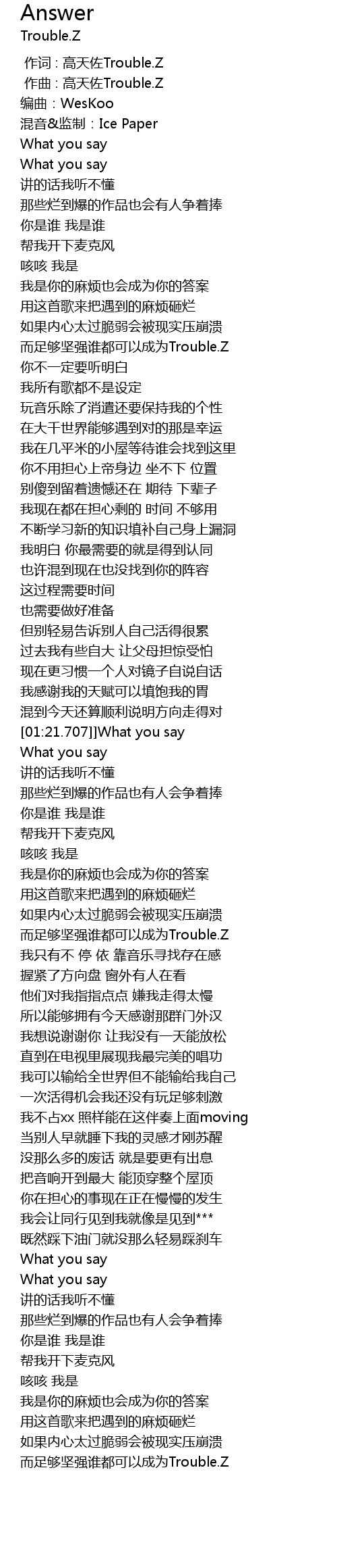 | [00:00.703] | zuò qǔ : gāo tiān zuǒ Trouble. Z |