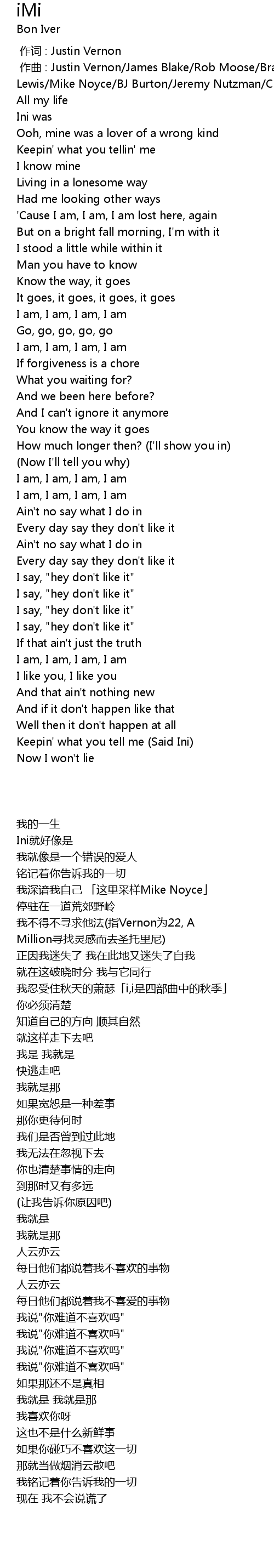 | [00:01.00] | zuò qǔ : Justin Vernon James Blake Rob Moose Brad Cook Mike Lewis Mike Noyce BJ Burton Jeremy Nutzman Channy Leaneagh Wheezy Josh Berg |