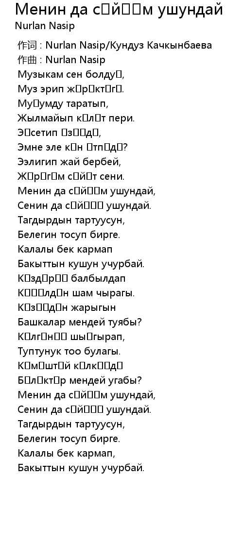 | [00:00.000] | 作词 : Nurlan Nasip/Кундуз Качкынбаева |