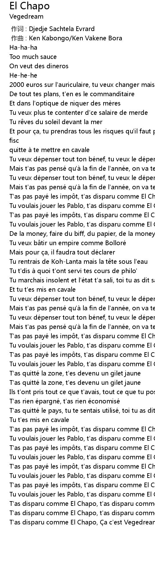 | [00:46.59] | T' as pas payé les imp t, t' as disparu comme El Chapo |