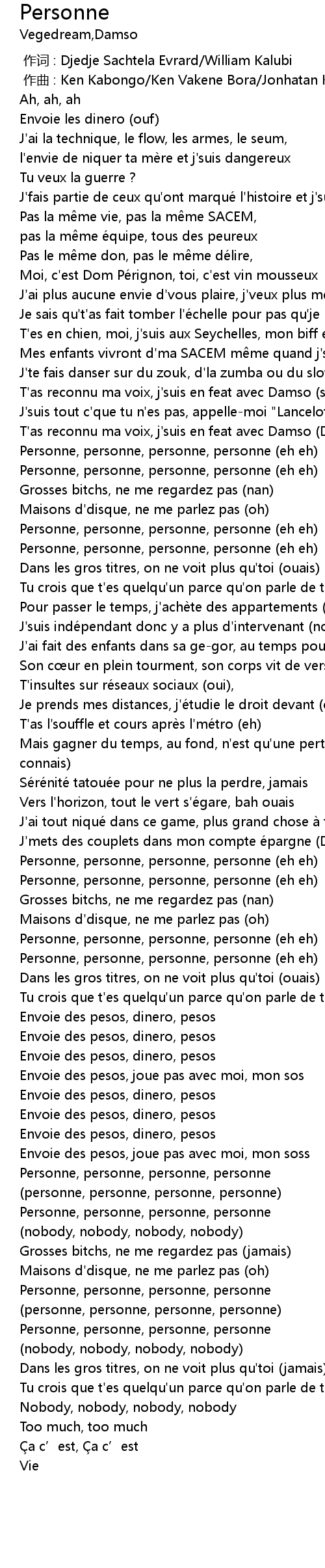| [01:08.43] | Personne, personne, personne, personne (eh eh) |
