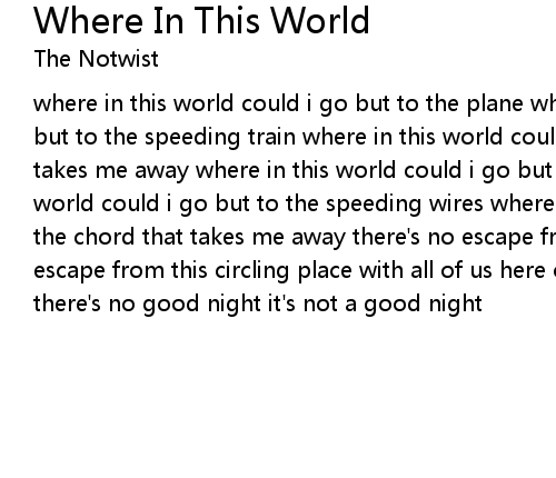 where in this world could i go but to the plane where in this world could i go but to the speeding train where in this world could i go but to the road that takes me away where in this world could i go but to the wires where in this world could i go but to the speeding wires where in this world could i go but to the chord that takes me away there's no escape from this circling place no no escape from this circling place with all of us here on this circling place there's no good night it's not a good night |