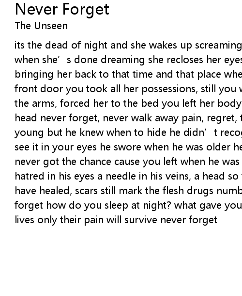 | its the dead of night and she wakes up screaming but her terror doesn' t end when she' s done dreaming she recloses her eyes and all she sees is your face bringing her back to that time and that place when you forced your way into her front door you took all her possessions, still you wanted more grabbed her by the arms, forced her to the bed you left her body but you' ll never leave her head never forget, never walk away pain, regret, till her dying day he was very young but he knew when to hide he didn' t recognize the smell booze but could see it in your eyes he swore when he was older he' d get his revenge but he never got the chance cause you left when he was ten now he walks the street with hatred in his eyes a needle in his veins, a head so full of lies all his wounds have healed, scars still mark the flesh drugs numb the pain but he' ll never forget how do you sleep at night? what gave you the right destroying people' s lives only their pain will survive never forget |