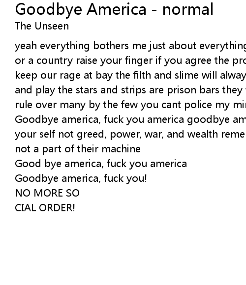 Goodbye america, fuck you america goodbye america, fuck you! pledge allegence to your self not greed, power, war, and wealth remember you were born a human being not a part of their machine