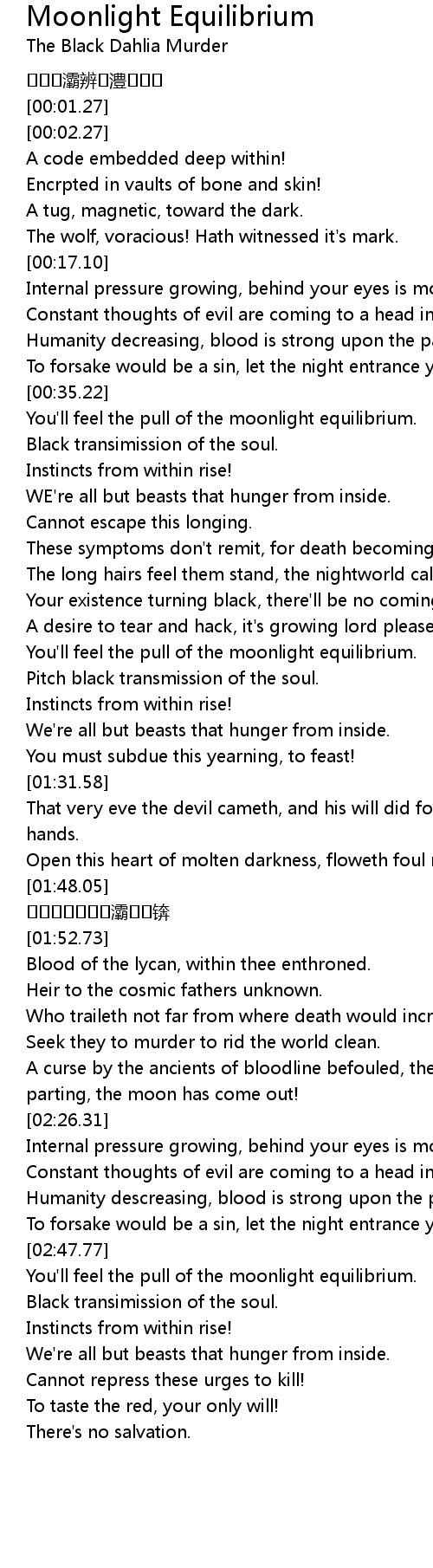 | [02:23.06] | A curse by the ancients of bloodline befouled, the clouds they are parting, the moon has come out! |