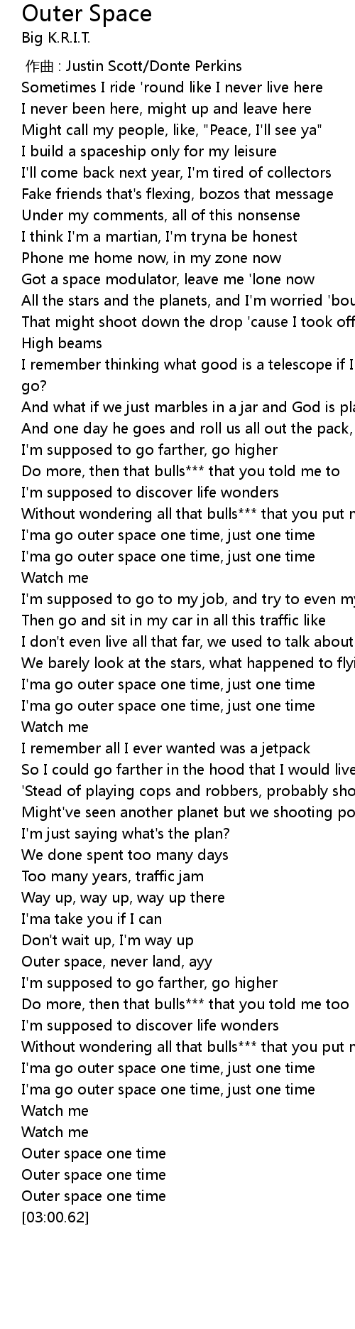 | [02:27.44] | I' ma go outer space one time, just one time |