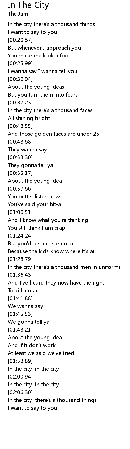 | [01:33.16] | In the city there's a thousand men in uniforms |