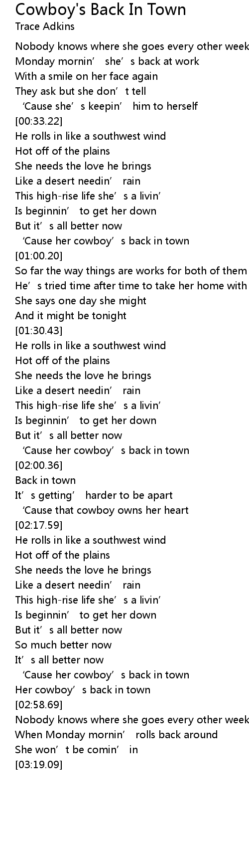 | [00:56.60] | ‘Cause her cowboy’s back in town |
