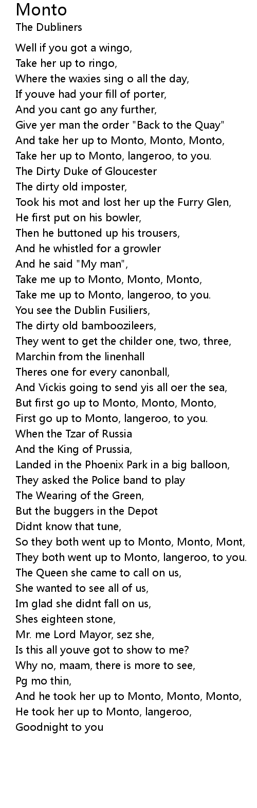 And take her up to Monto, Monto, Monto, |