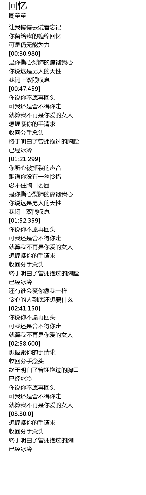 | [02:43.690] | nǐ shuō nǐ bù yuàn zài huí tóu |