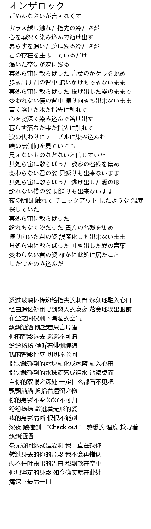 | [03:44.021] | 深夜 触碰到 “Check out.” 熟悉的 温度 找寻着 |