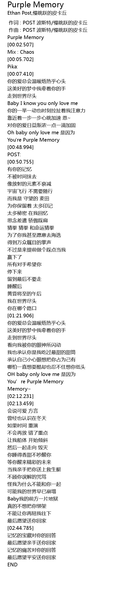 | [00:00.000] | 作词 : POST 波斯特/慢跳跃的皮卡丘 |