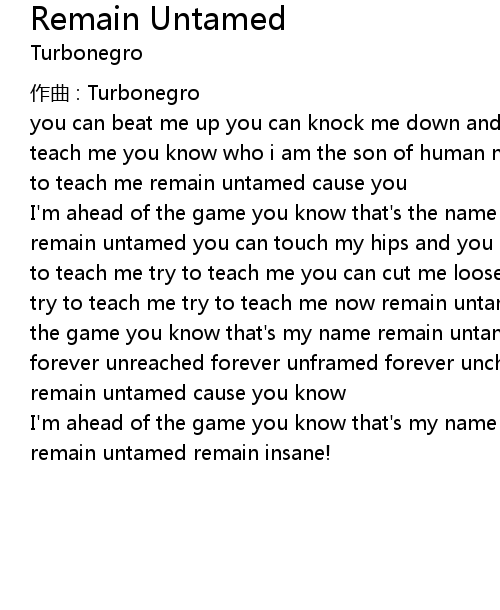 | I' m ahead of the game you know that' s the name remain untamed remain untamed remain untamed you can touch my hips and you can twist my tits but you can try to teach me try to teach me you can cut me loose let loose the shoes? you can try to teach me try to teach me now remain untamed cause you know i am ahead of the game you know that' s my name remain untamed remain untamed remain untamed forever unreached forever unframed forever unchained i said remain untamed remain untamed cause you know | |
