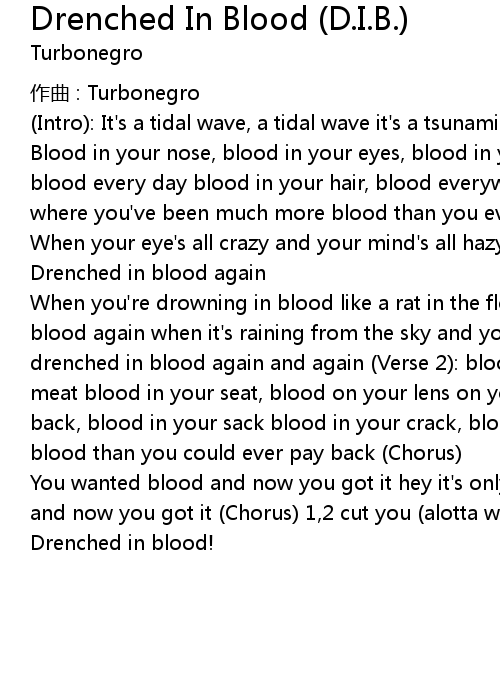 | When you' re drowning in blood like a rat in the flood now you' re drenched in blood again when it' s raining from the sky and you know you' re gonna die now drenched in blood again and again Verse 2: blood on your feet, blood on your meat blood in your seat, blood on your lens on your mercedesbenz blood on your back, blood in your sack blood in your crack, blood on your tracks much more blood than you could ever pay back Chorus | |