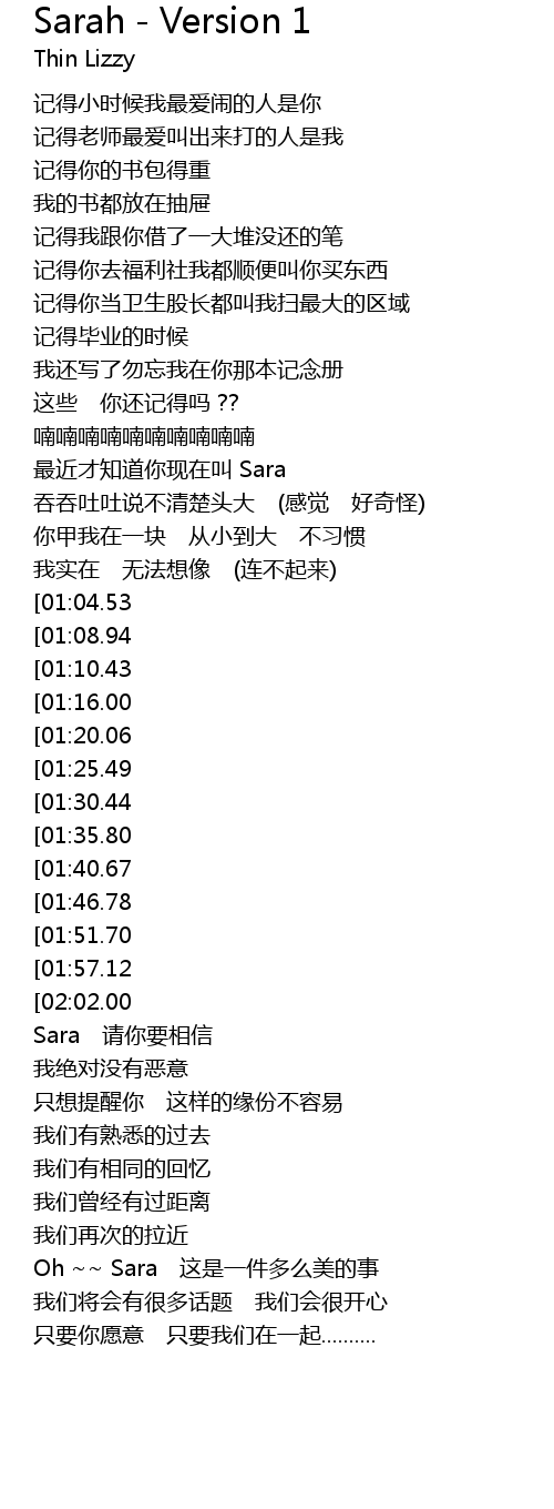 | [02:39.72][01:35.80] | Oh Sara zhǐ shì wǒ men zhǎng dà |