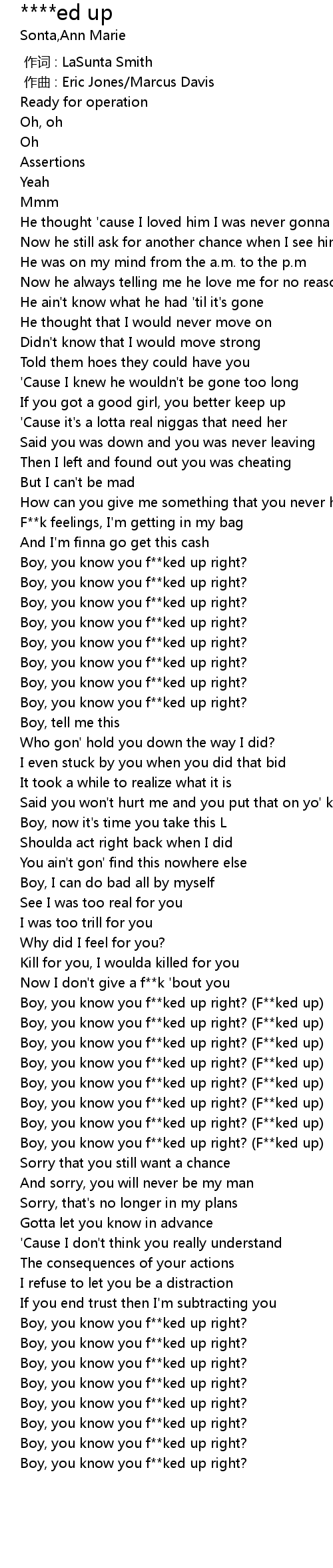 | [01:54.592] | Boy, you know you f**ked up right? (F**ked up) |