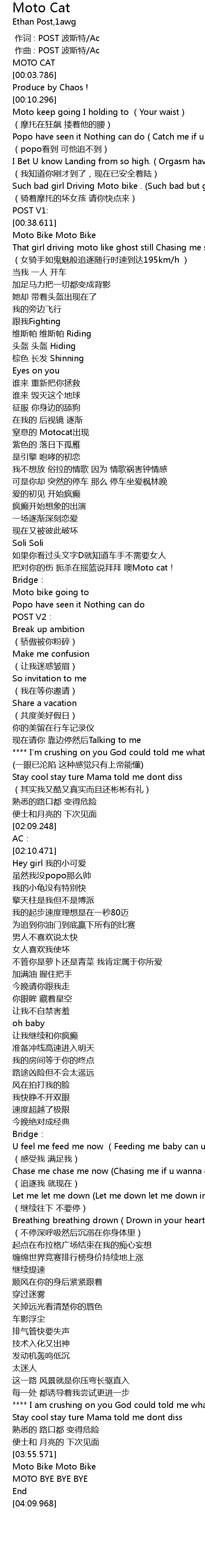 | [00:30.929] | Such bad girl Driving Moto bike . (Such bad but give me that) |