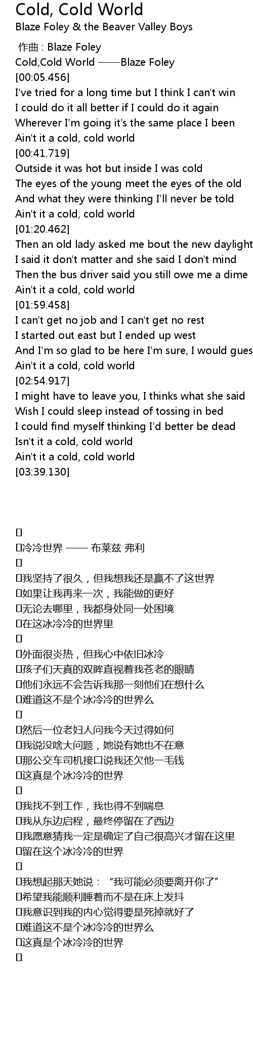 | [03:32.877] | Ain' t it a cold, cold world |