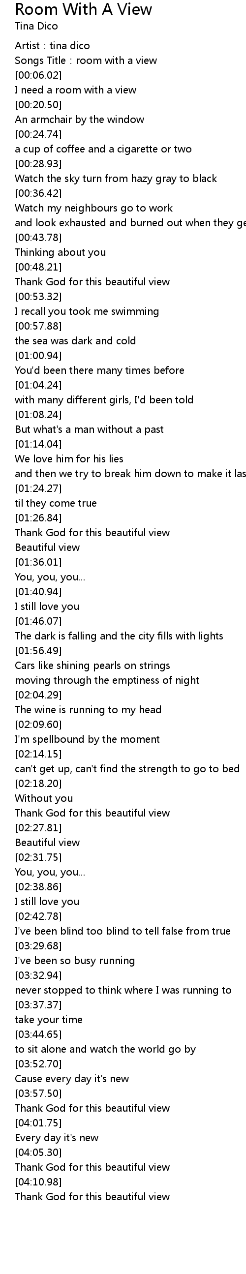 | [00:03.97] | Songs Title: room with a view |