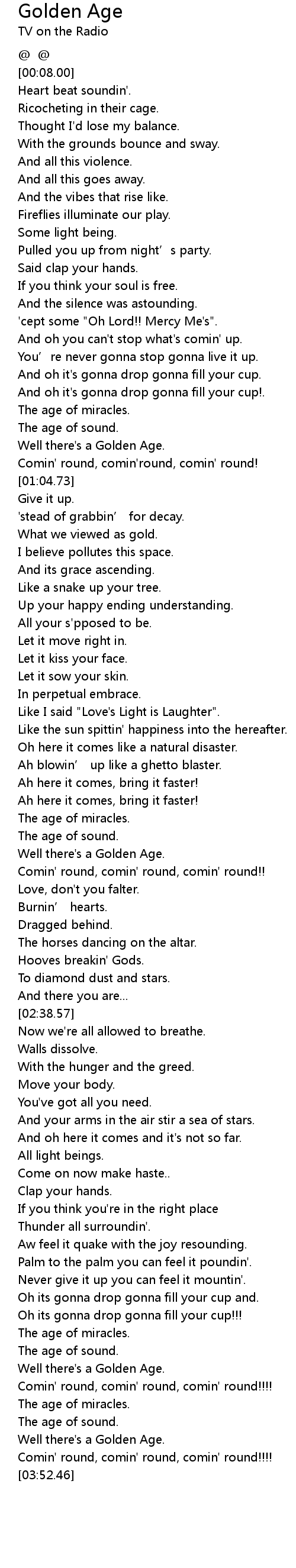 | [02:00.81] | Well there' s a Golden Age. |