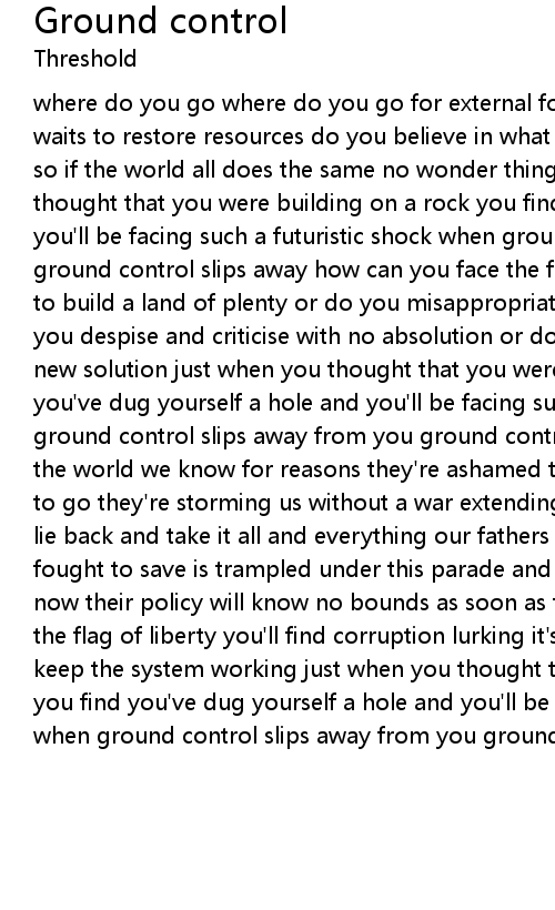 where do you go where do you go for external forces your body wakes but never waits to restore resources do you believe in what you do or is it just for money so if the world all does the same no wonder things are funny just when you thought that you were building on a rock you find you've dug yourself a hole and you'll be facing such a futuristic shock when ground control slips away from you ground control slips away how can you face the future do you create and generate to build a land of plenty or do you misappropriate until the world is empty do you despise and criticise with no absolution or do you stop to analyse to find a new solution just when you thought that you were building on a rock you find you've dug yourself a hole and you'll be facing such a futuristic shock when ground control slips away from you ground control slips away they're cutting up the world we know for reasons they're ashamed to show and all we love will have to go they're storming us without a war extending force until we fall while we lie back and take it all and everything our fathers made and everything they fought to save is trampled under this parade and nothing's going to stop them now their policy will know no bounds as soon as they control the ground under the flag of liberty you'll find corruption lurking it's our responsibility to keep the system working just when you thought that you were building on a rock you find you've dug yourself a hole and you'll be facing such a futuristic shock when ground control slips away from you ground control slips away |